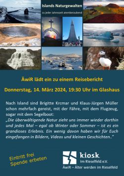 Meine Frau Brigitte Krcmar und ich präsentieren am 14. März 2014 im Stadtteil Rieselfeld einen Bericht über unsere Reisen nach Island - u.a. auch über einen Segeltörn im Jahre 2017 auf der LOGOFF mit HSCF-Mitgliedern.
