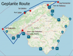 Bei günstigen Winden soll die Route von Palma de Mallorca an der wild zerklüfteten Felsenküste im Nord-Westen bis zum Cap Formentor im Norden verlaufen.